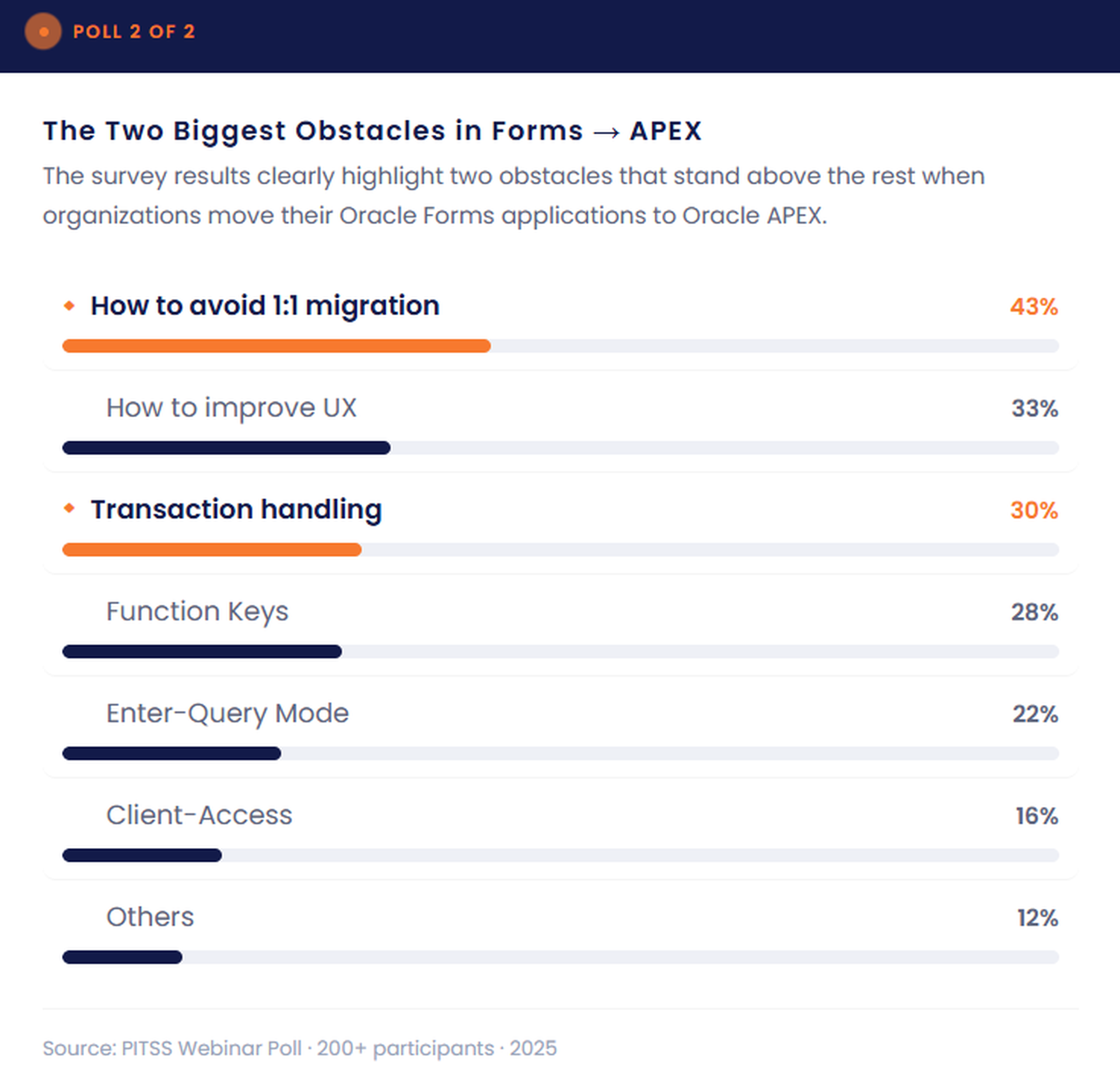 The most frequently mentioned challenge is avoiding a 1:1 migration. Replicating an existing Oracle Forms application exactly as it is in APEX may seem like the fastest approach — but this strategy often reproduces the same limitations that already exist in the legacy system.